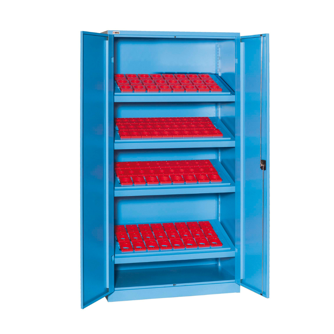 - Sistem de polițe dedicate: Dulapul este echipat cu 4 polițe special configurate pentru a susține suporturi de scule standardizate (tool holders).