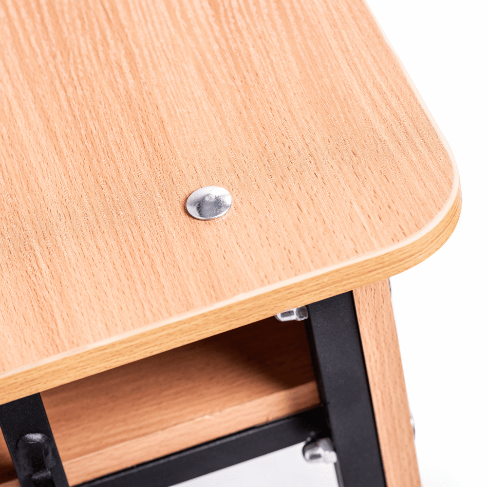 - Siguranță sporită: Blatul este finisat cu colțuri rotunjite, un detaliu de design esențial pentru a preveni accidentările în mediul dinamic al sălii de clasă.
