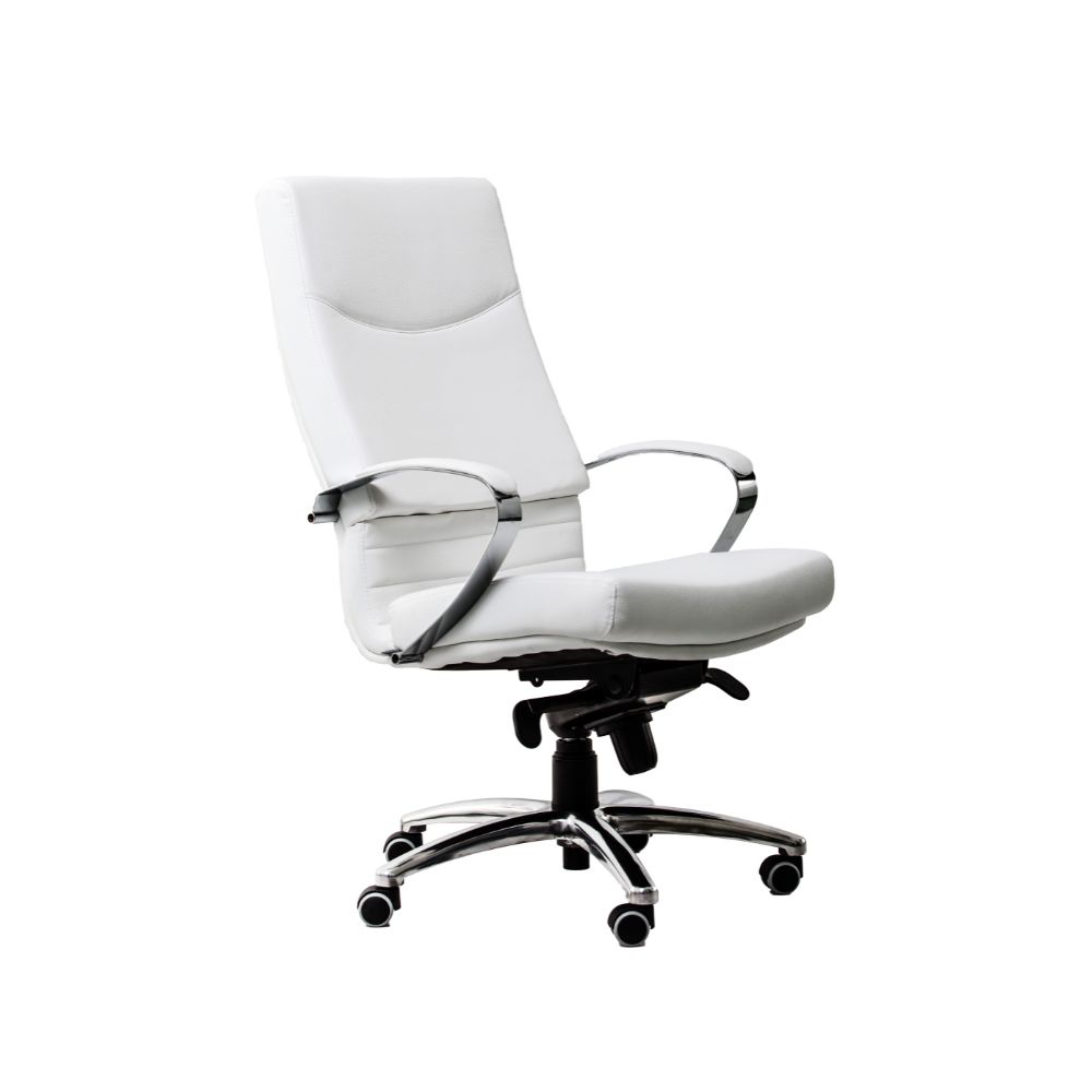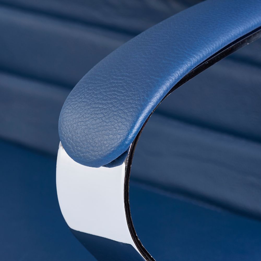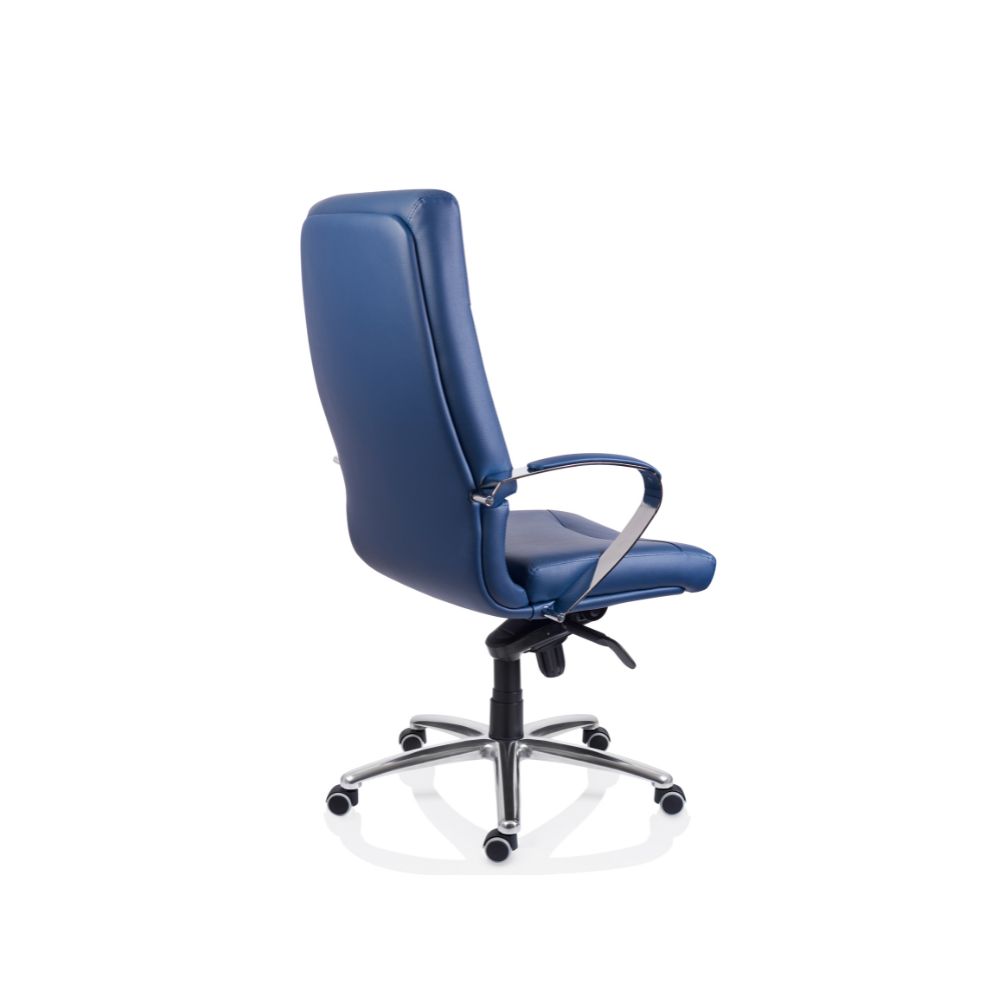 - Design executiv și materiale durabile: Brațele fixe, cu structură din oțel cromat și tapițerie parțială din piele ecologică sau naturală, adaugă un aspect elegant și profesional. Spătarul și șezutul, realizate din poliuretan injectat de înaltă densitate, își păstrează forma în timp și oferă un confort de durată.